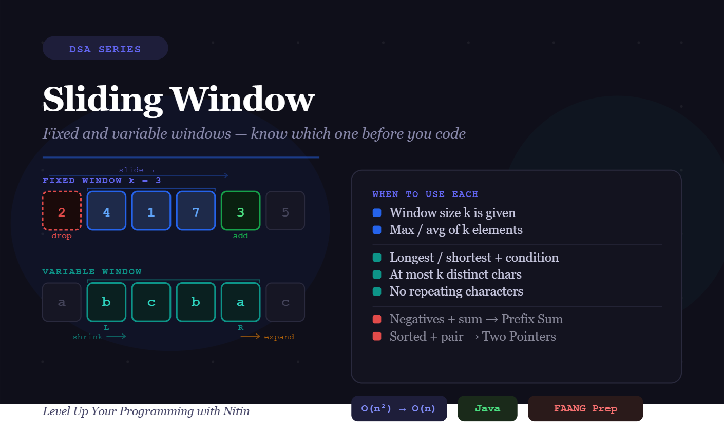 “A nested loop recomputes everything from scratch. Sliding Window carries the result forward — adding one element on the right, dropping one on the left. The window doesn’t restart. It remembers.”
